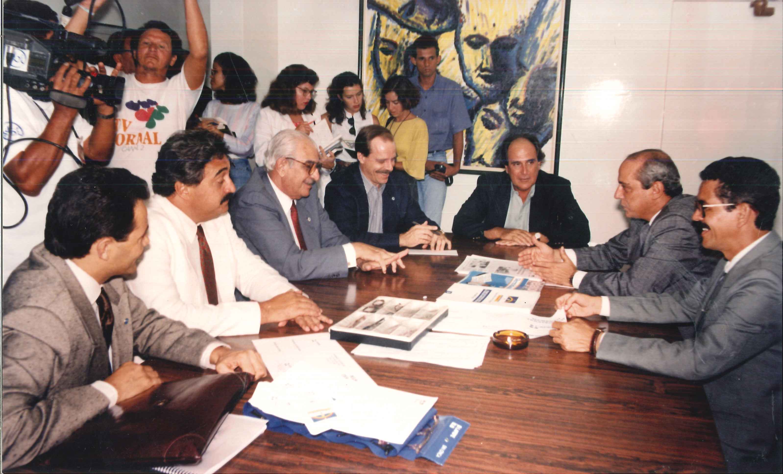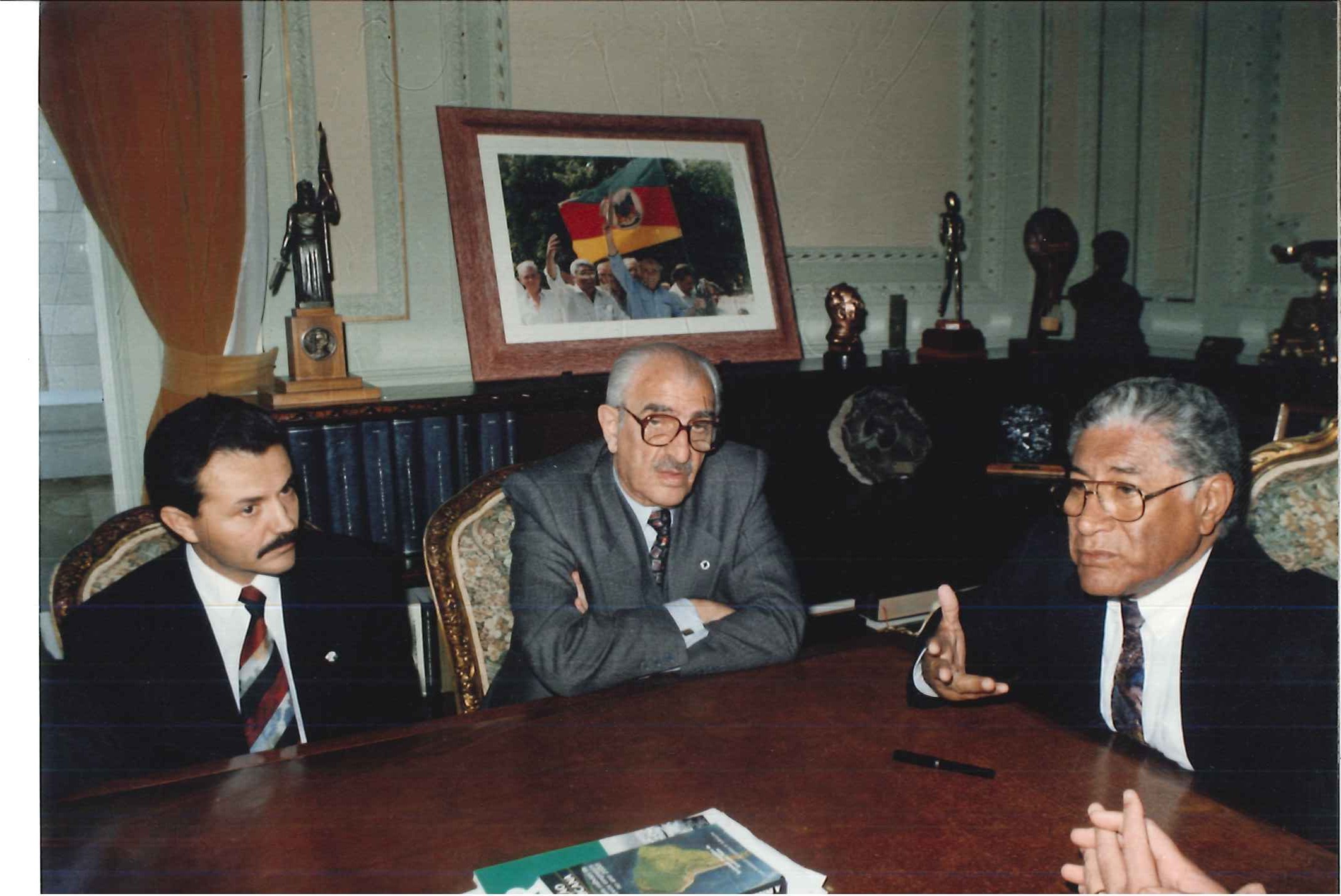 "Min. da Saúde, Jamil Haddad, acompanhado do seu chefe de gabinete, Carlos Siqueira, visitam o Pref. De Porto Alegre, Tarso Genrro (ao centro) em fevereiro de 1993."