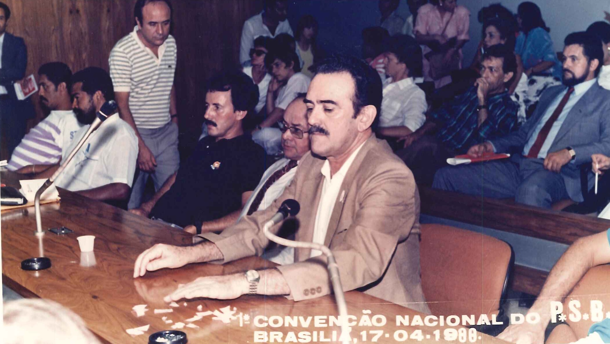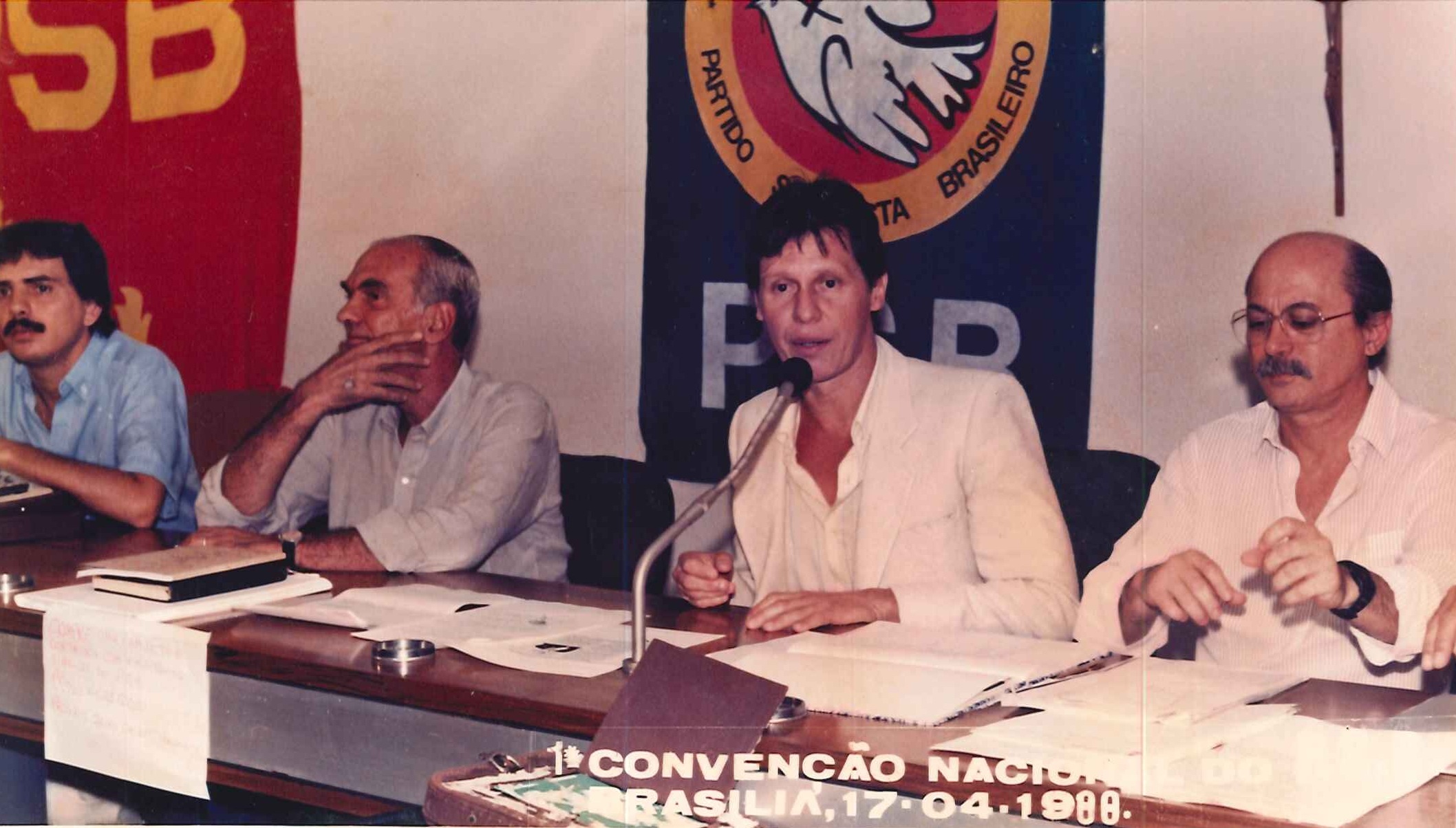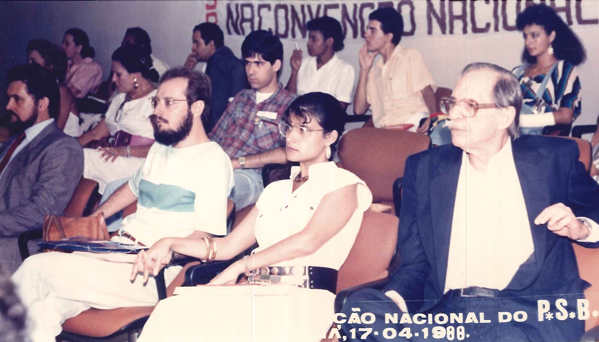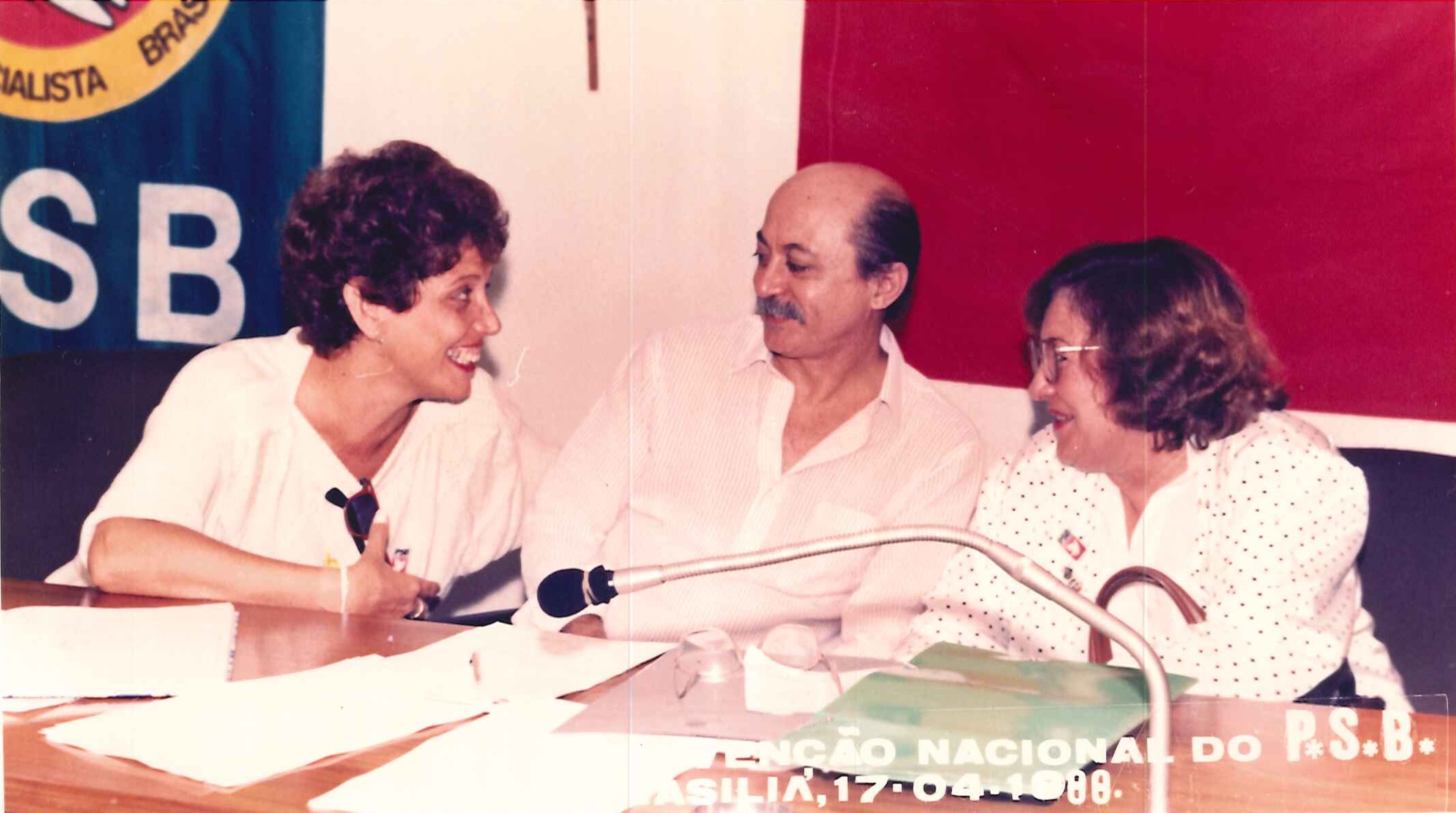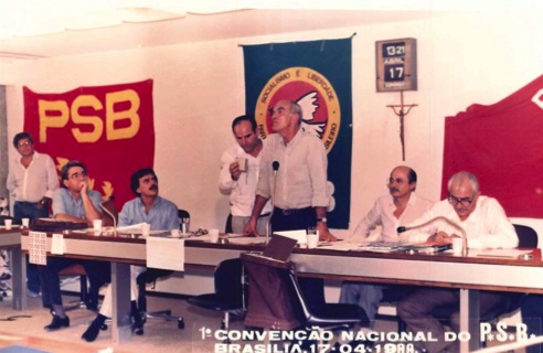 "Militantes socialistas delegados à Primeira Convenção Nacional do PSB, realizada em 17 de abril de 1988. Na foto, o Presidente Nacional do partido, Jamil Haddad, Deputado José Carlos Sabóia e o Secretário Geral Roberto Amaral. "