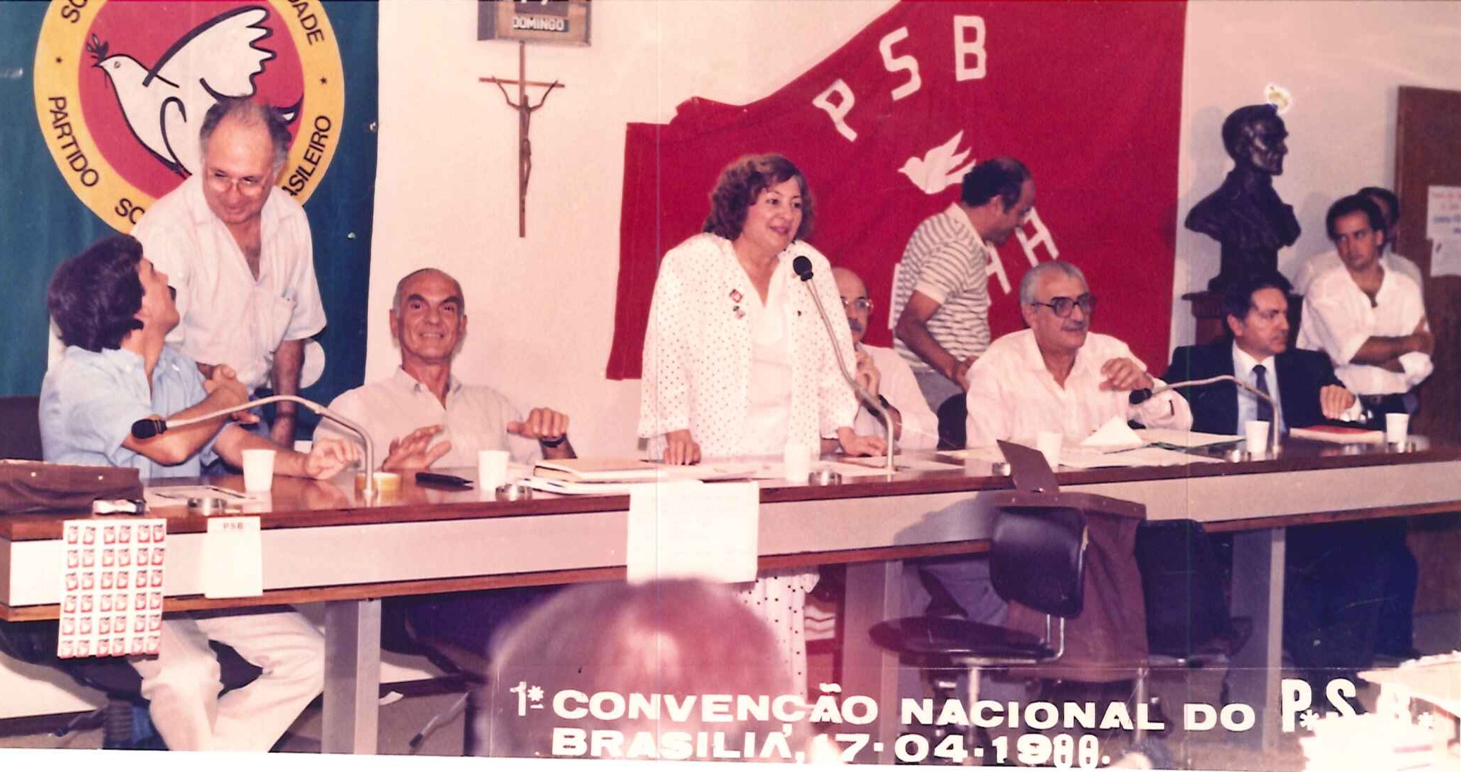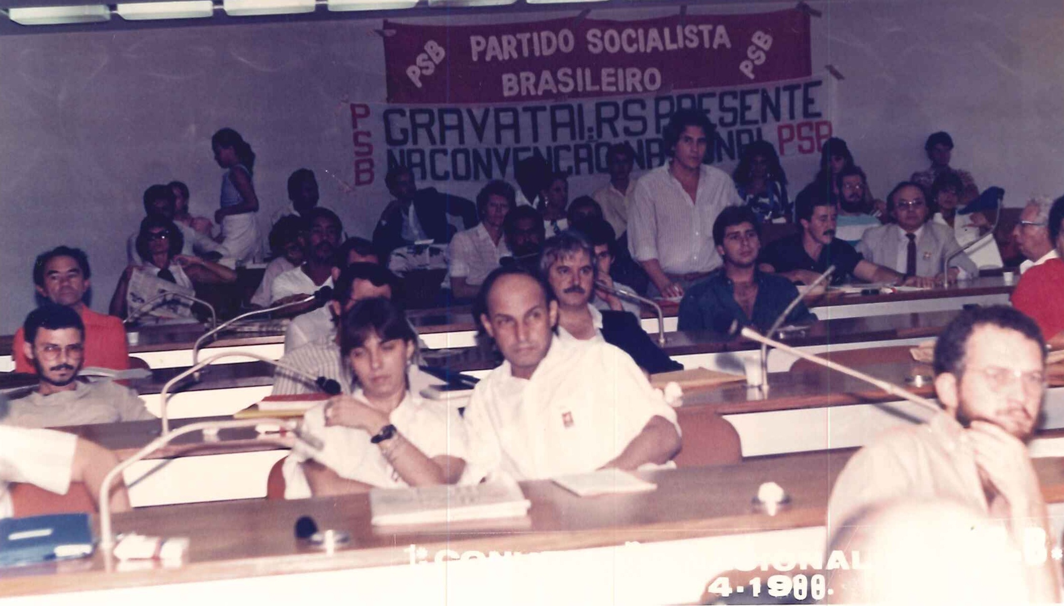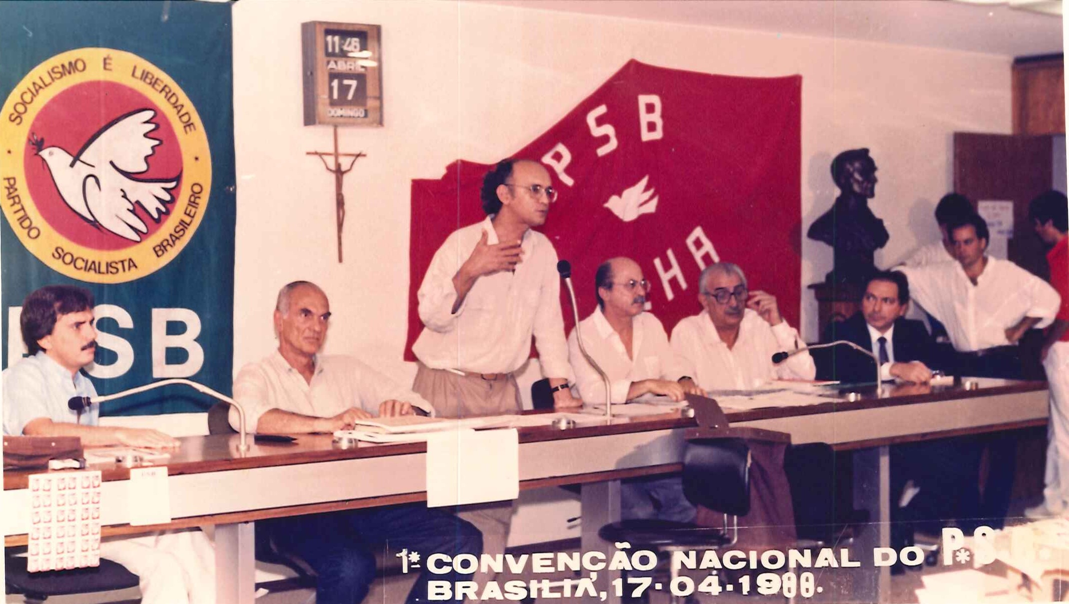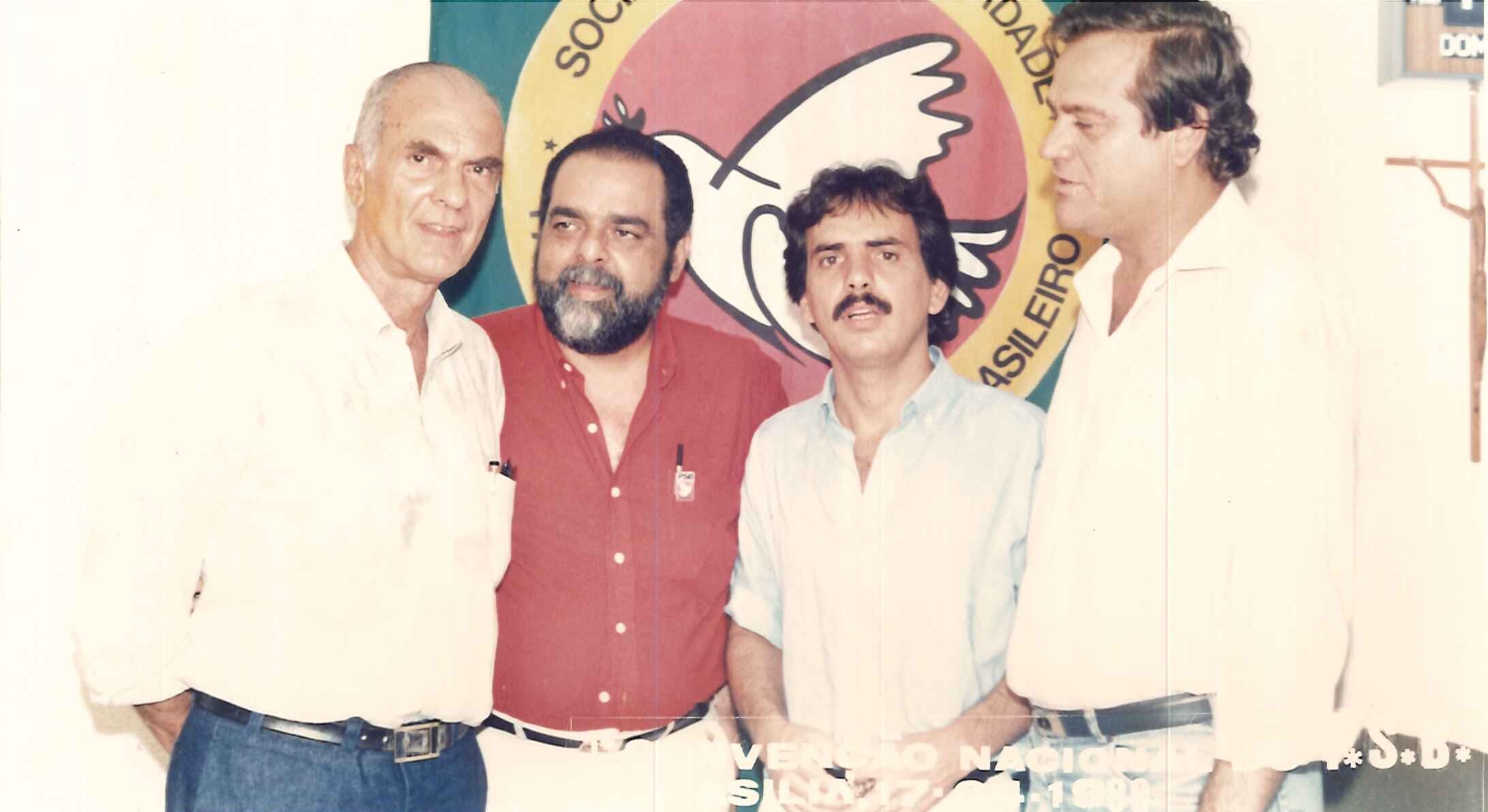 "Militantes socialistas delegados à Primeira Convenção Nacional do PSB, realizada em 17 de abril de 1988. Na foto, o Presidente Nacional do partido, Jamil Haddad, Deputado José Carlos Sabóia e o Secretário Geral Roberto Amaral. "