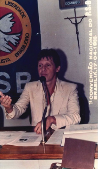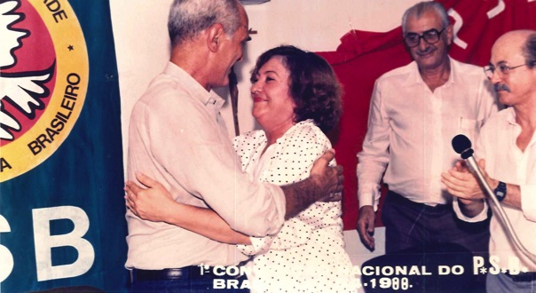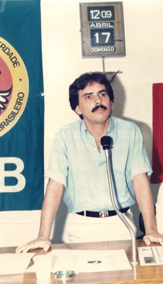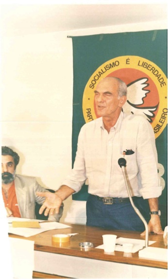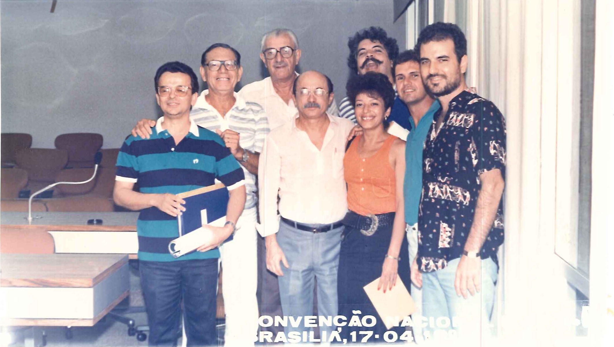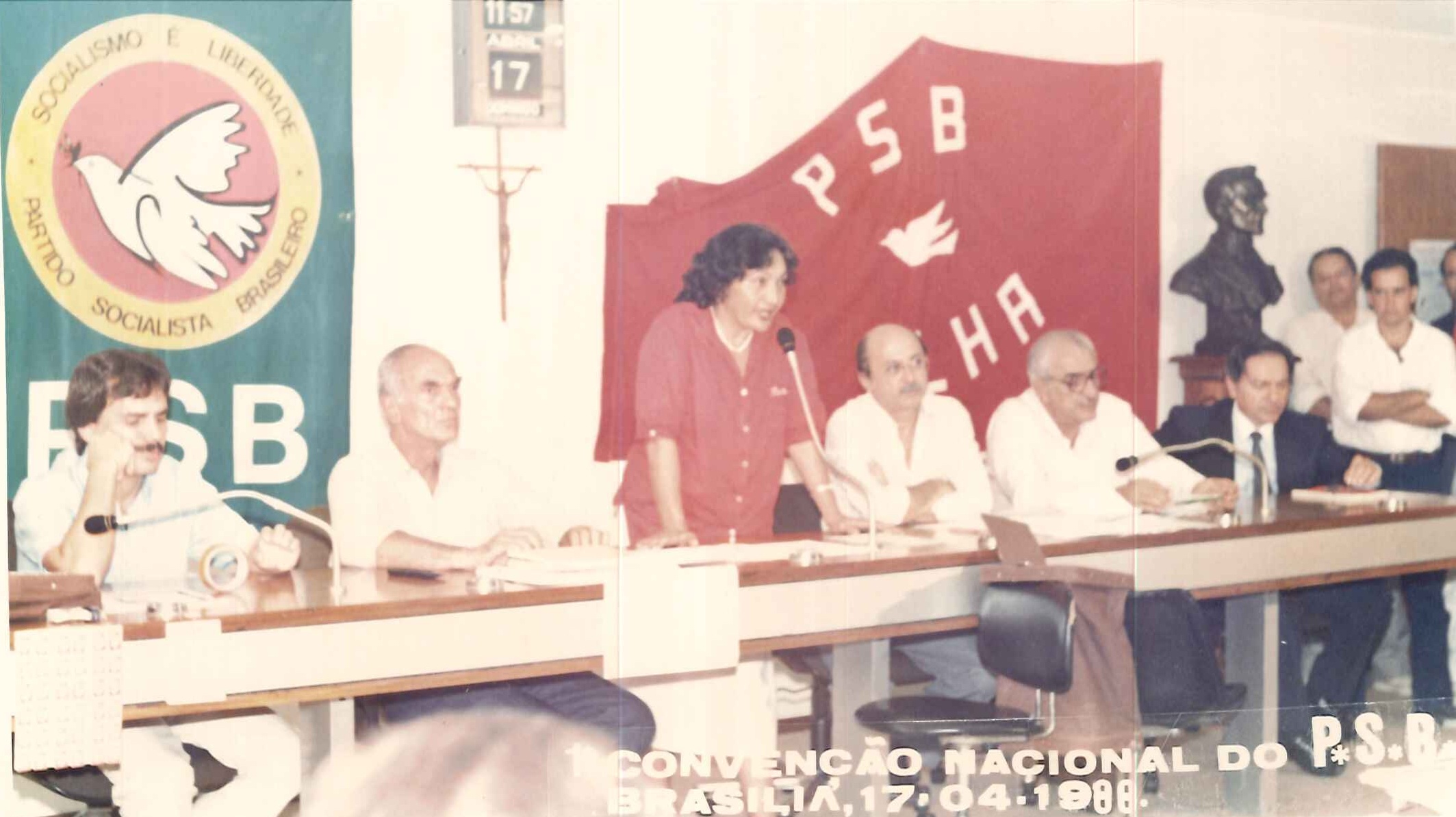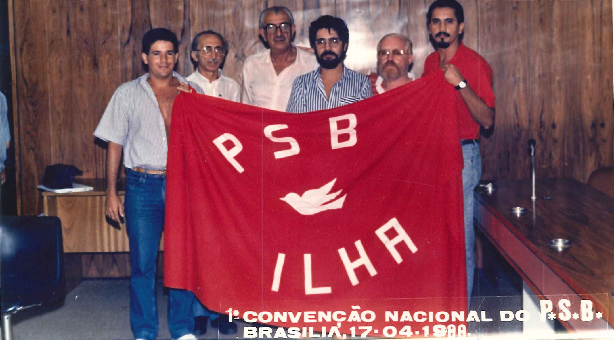 "Militantes socialistas delegados à Primeira Convenção Nacional do PSB, realizada em 17 de abril de 1988. Na foto, o Presidente Nacional do partido, Jamil Haddad, Deputado José Carlos Sabóia e o Secretário Geral Roberto Amaral. "