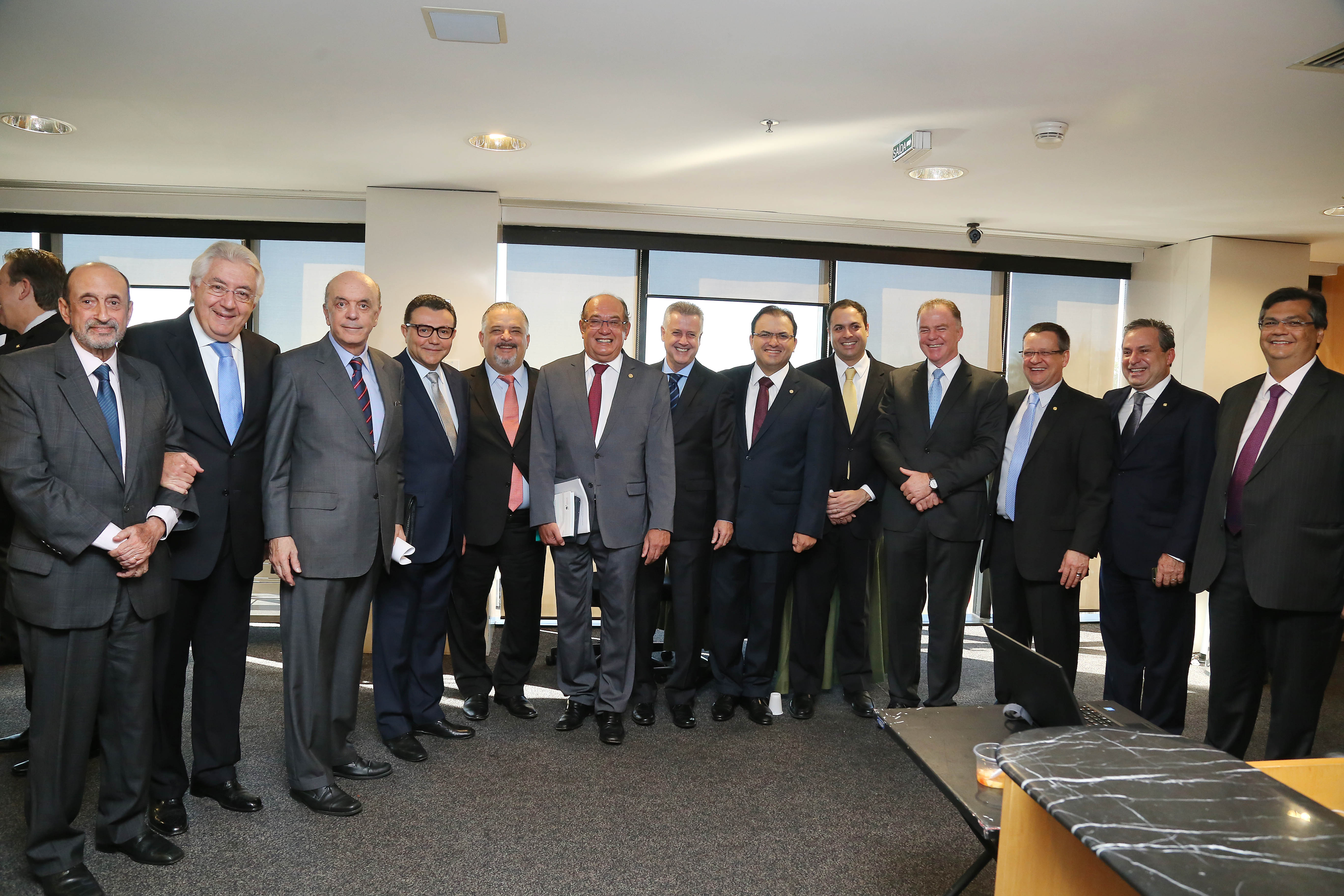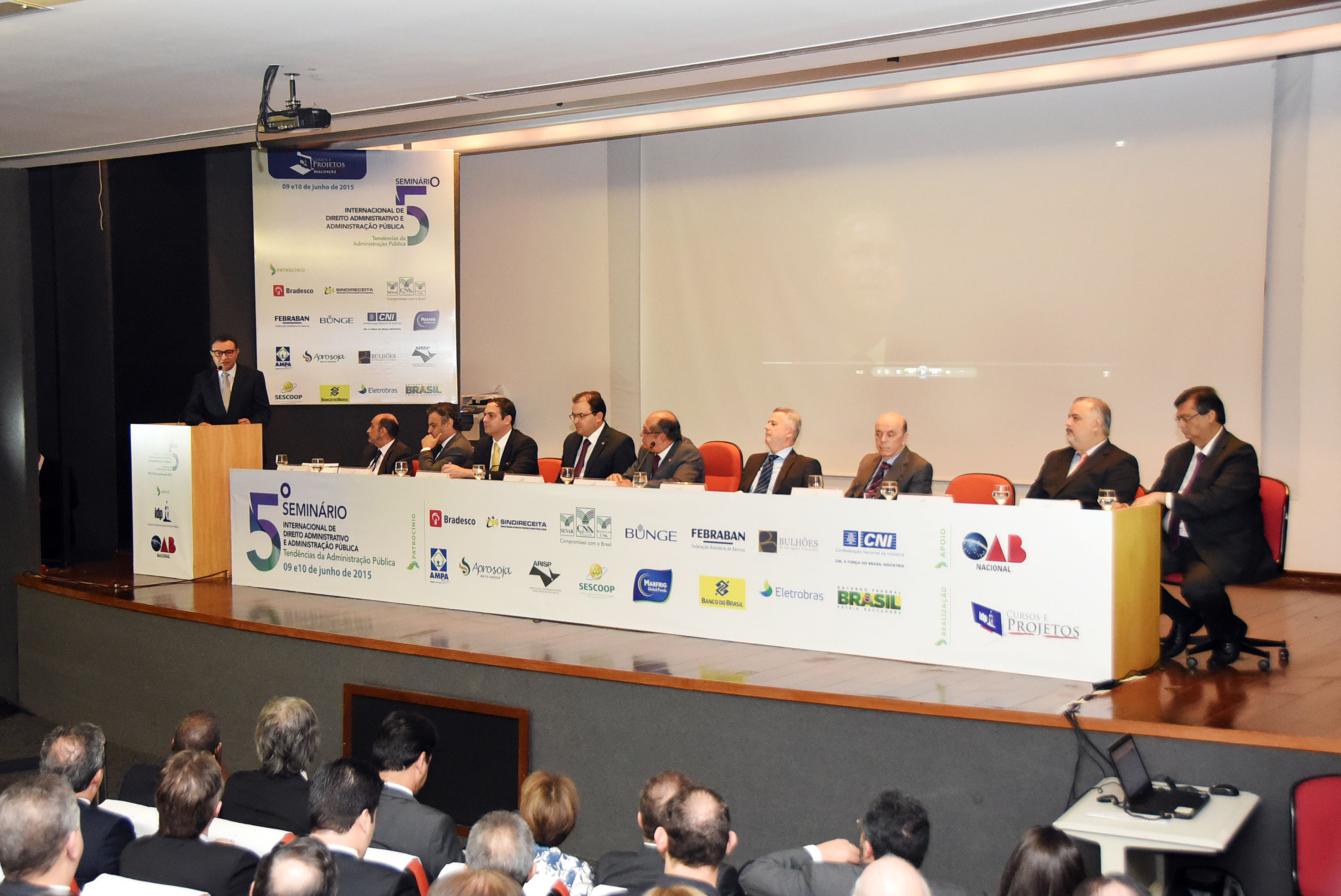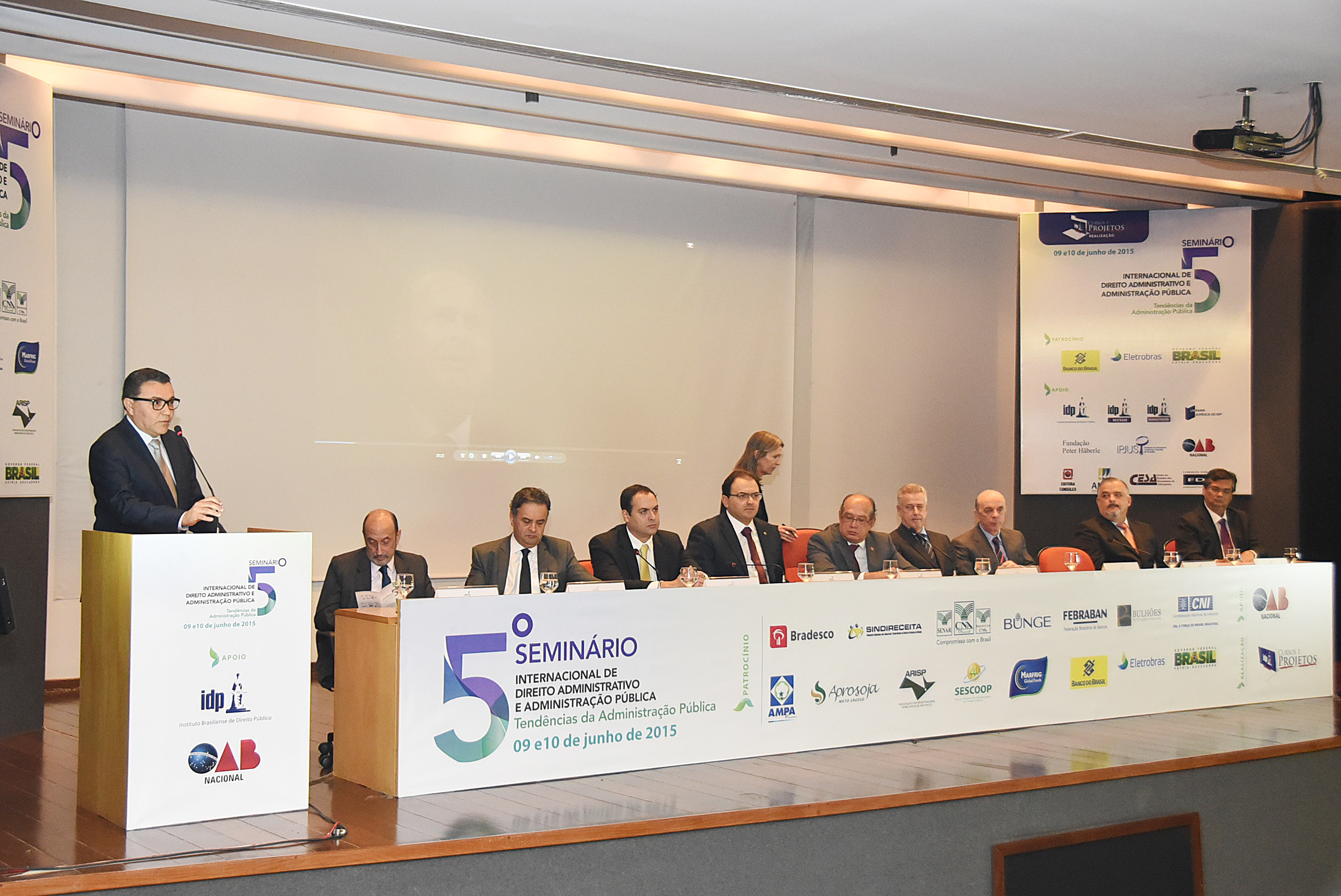 "Discursando: presidente do PSB, Carlos Siqueira. Compondo a mesa: ex-ministro do STJ Gilson Dipp; senador Aécio Neves (MG); governador Paulo Câmara (PE); presidente da OAB, Marcus Vinicius Coêlho; ministro do Tribunal Superior Eleitoral, Gilmar Mendes; governador Rodrigo Rollemberg (DF); senador José Serra (SP); vice-governador Márcio França (SP) e governador Flávio Dino (MA). "
