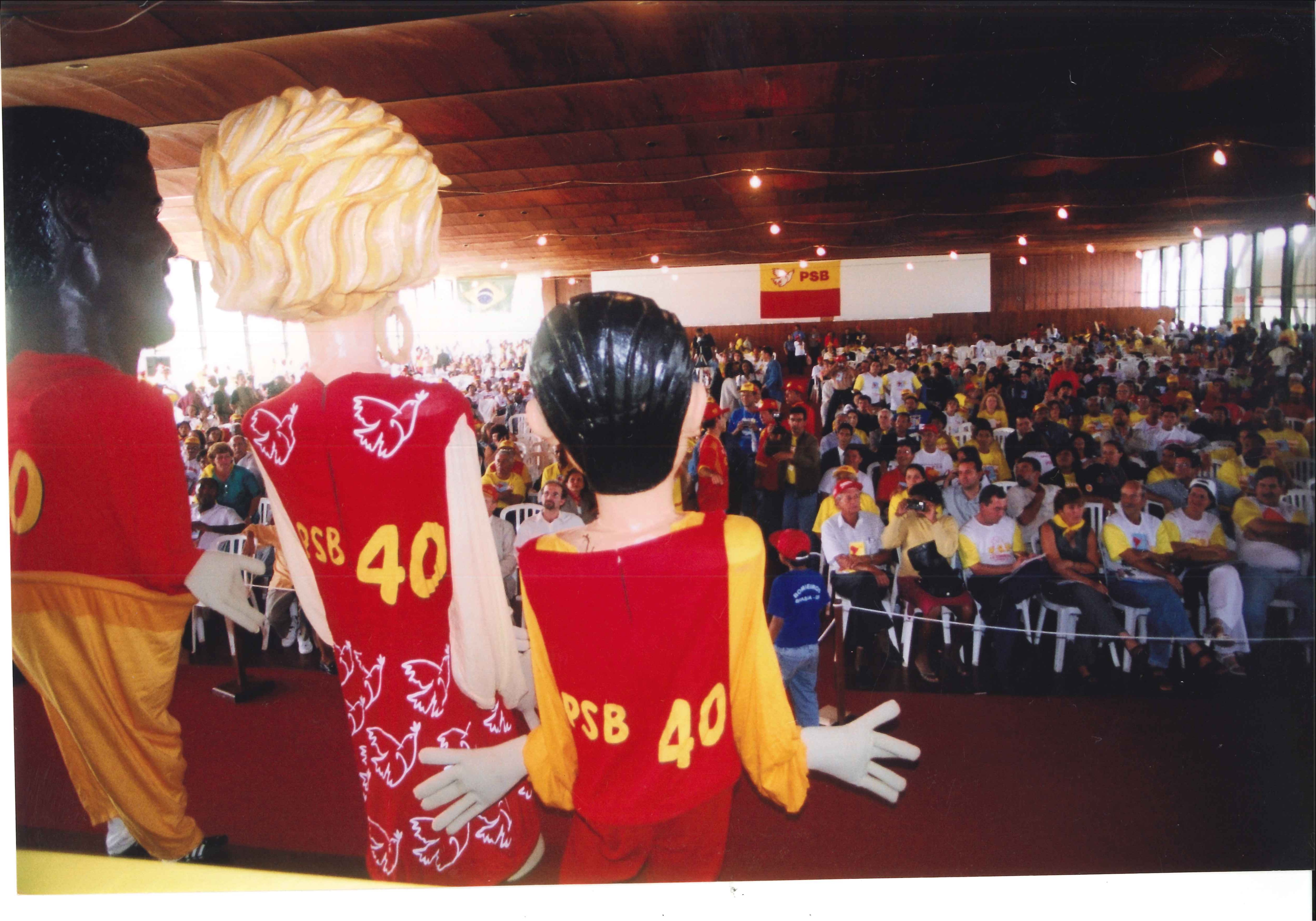 Integrantes da plenária do VIII Congresso assistindo desfile de bonecos gigantes com o número e o símbolo do PSB.